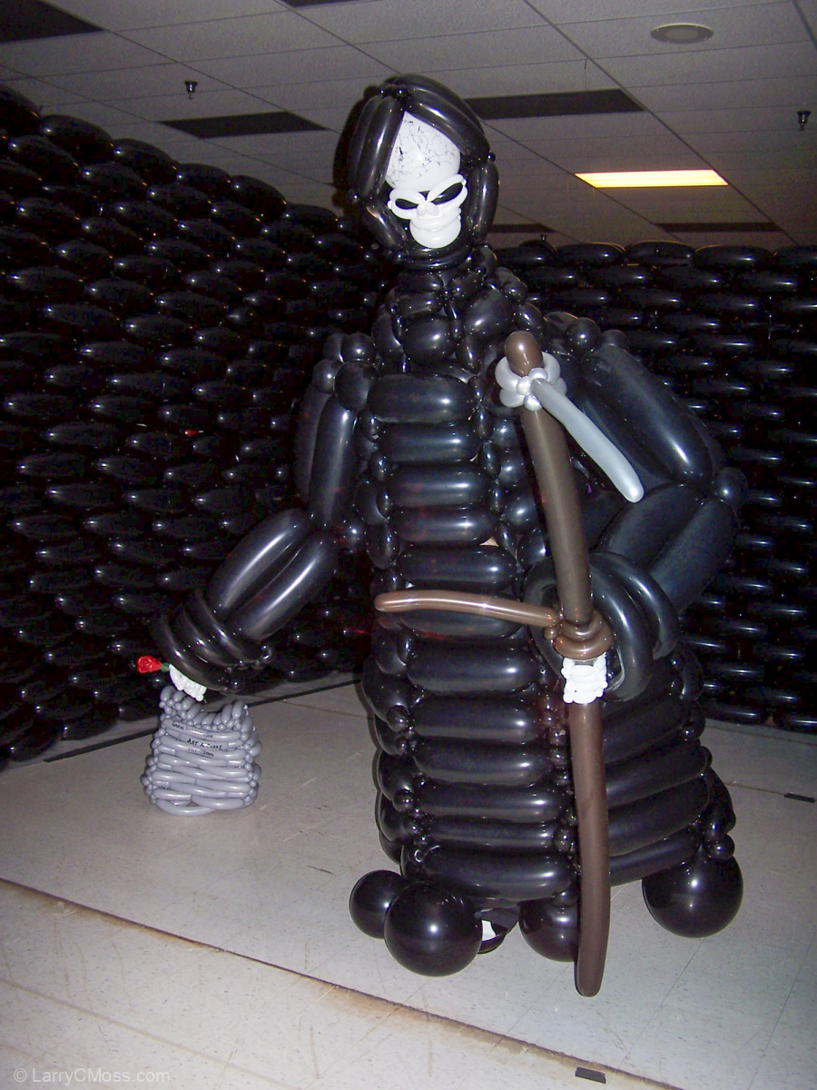 We used more than 50,000 balloons in that first Manor. Ten rooms. Haunted hallways. Castle walls made of inflated bricks. A garden of twisted greenery. A library filled with balloon books. And in the center of it all: the first appearance of the Grim Reaper, although, to be fair, he was more cheerful than grim. He sort of became our accidental mascot. He became known as Grimmy, the not so Grim Reaper.
