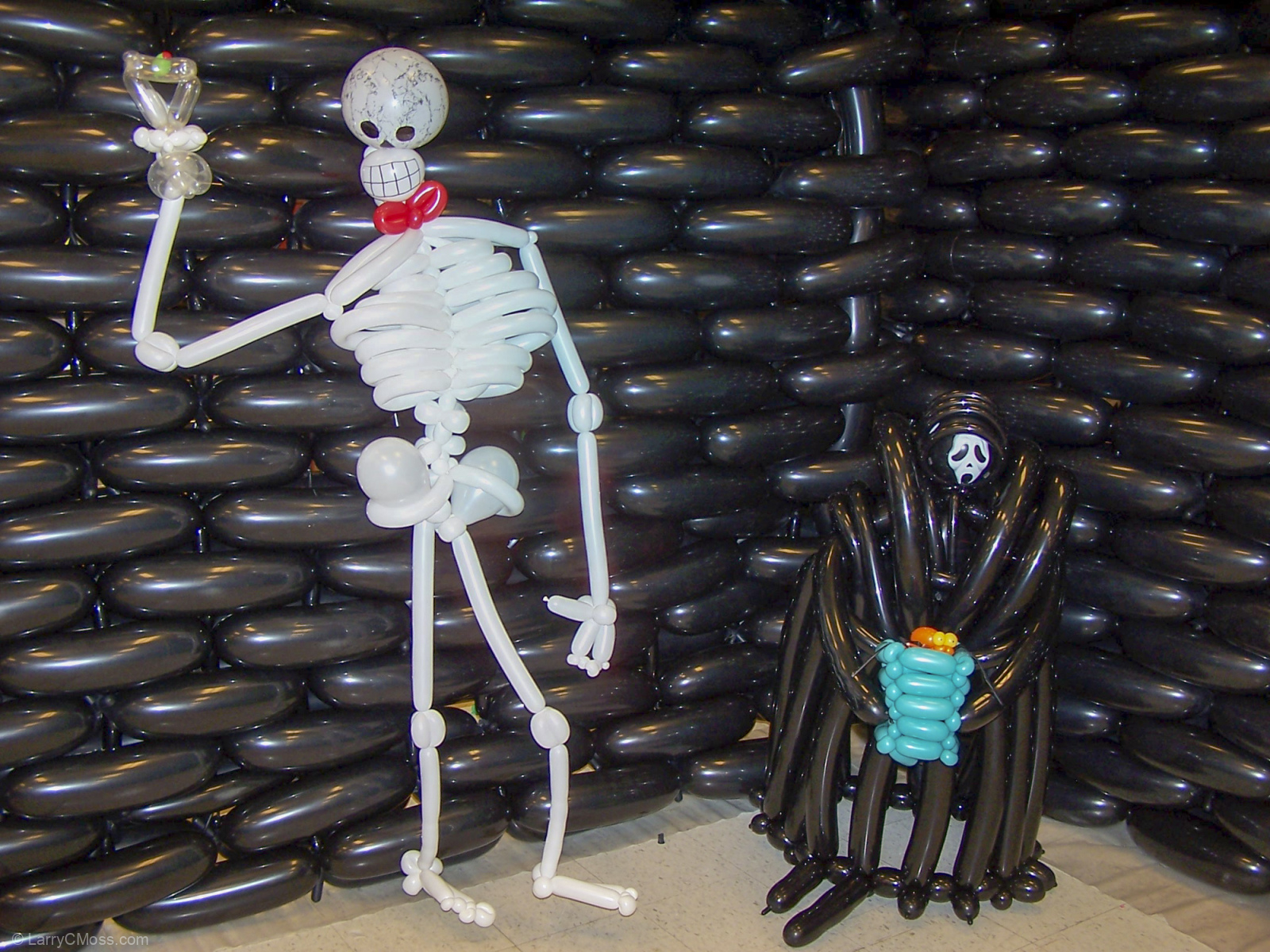 In 2004, the first Balloon Manor rose up in an empty storefront in Henrietta, NY. A 10-room, 10,000 square foot, silly, creepy, funny, weird, slightly haunted castle built entirely from latex balloons. The story we told was that of a grand castle and the creatures within, cursed to become nothing but air-filled shells of their former selves. The inhabitants included cheerful balloon ghosts, grinning ghouls, and one very energetic Not-So-Grim Reaper. We called it Scarigami.