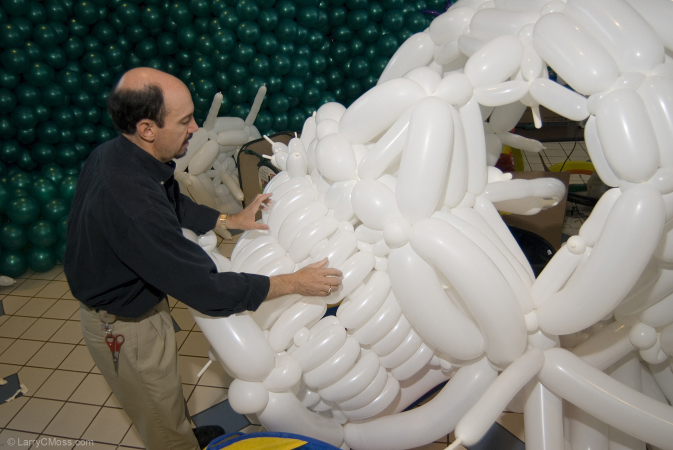 Behind the scenes, we learned a lot. There was much more room to experiment than there had been on the previous big projects. We developed systems for building the big wall pieces, and learned how balloon sculptures scaled. We learned how much our existing tools could handle, and that Richard Hughson, the MacGyver of the crew was an essential team member, even if he never touched a balloon. He could fix anything, it seemed, and even started designing tools for future projects based on how things were used and, more importantly, how we broke them. He always seemed to have solutions to new problems the moment they appeared.