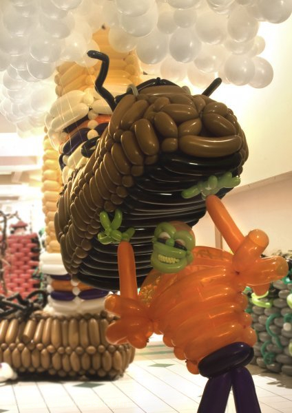 Inspired by Jurassic Park, we built balloon dinosaurs—giant, looming, colorful beasts that roamed the wing of Irondequoit’s Medley Centre Mall like they owned the place. Our ghouls and ghosts now rode roller coasters, ran concession stands, and served as park mascots. We had balloon rides, freakish foliage, and skeletal staff.